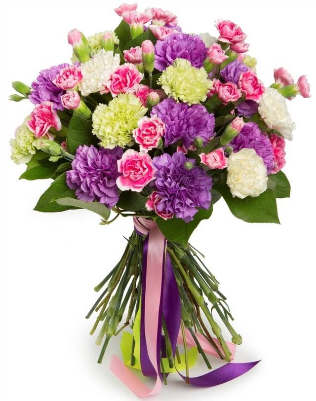 Основным цветком в этом букете является гвоздика. Она символизирует очарование и помогает выразить с помощью такой композиции нежные чувства и увлеченность. Использование при создании букета только гвоздик разных видов и цветов делает его очень оригинальным, ярким и привлекательным. В нем присутствуют нежные белые, насыщенные фиолетовые, яркие желтые и изысканные розовые гвоздики. Благодаря этому он непременно порадует получателя и подарит ему множество положительных эмоций и море эстетического наслаждения.