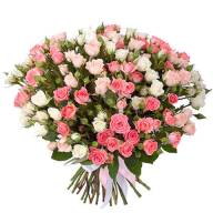 Композиция состоит из кустовых роз белого и розового оттенков. Розовые розы издавна считаются символом искренних чувств, расположенности и надежды на удачное и стремительное развитие отношений. В то же время, белые цветы символизируют чистоту и искренность. Букет уместен не только для подарка любимой девушке, но и как презент близким друзьям.