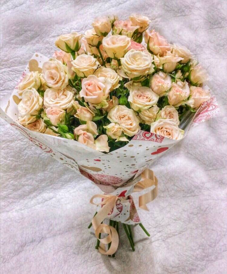 Букет «Крем-брюле» состоит из нескольких кустарных роз светлой цветовой гаммы. Спектр цветов берет начало в белом и заканчивается на розовом цвете, включая в себя множество растений с разными оттенками. Белые розы всегда были наиболее популярным символом чистоты, непорочности и отсутствия корысти. Букет прекрасно подходит для извинений перед друзьями или любимыми.