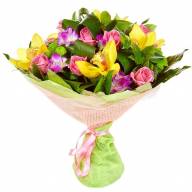 Красочный и невероятно яркий, букет «Радуга» состоит, в основном, из орхидей ярко-желтого цвета, а также нежно-розовых роз. Использование листьев салала насыщенного зеленого цвета в качестве дополнительного украшения, делает букет более выразительным и оригинальным. Розы такого оттенка подчеркивают изысканность и элегантность, а также помогают выразить чувство симпатии. Цветочная композиция непременно порадует получателя, она станет универсальным подарком в честь любого праздника или просто в обычный день.
