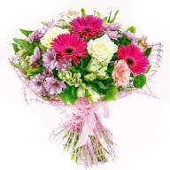 Преподнести изящный букет из альстромерий, роз, гербер, хризантем и лизиантуса ясным весенним утром – значит подарить любимому человеку заряд хорошего настроения на весь день. Каждый из цветков композиции наделен богатым разнообразием сортов и оттенков. Попадая в руки профессиональных флористов, они обретают более эффектный и незабываемый вид.